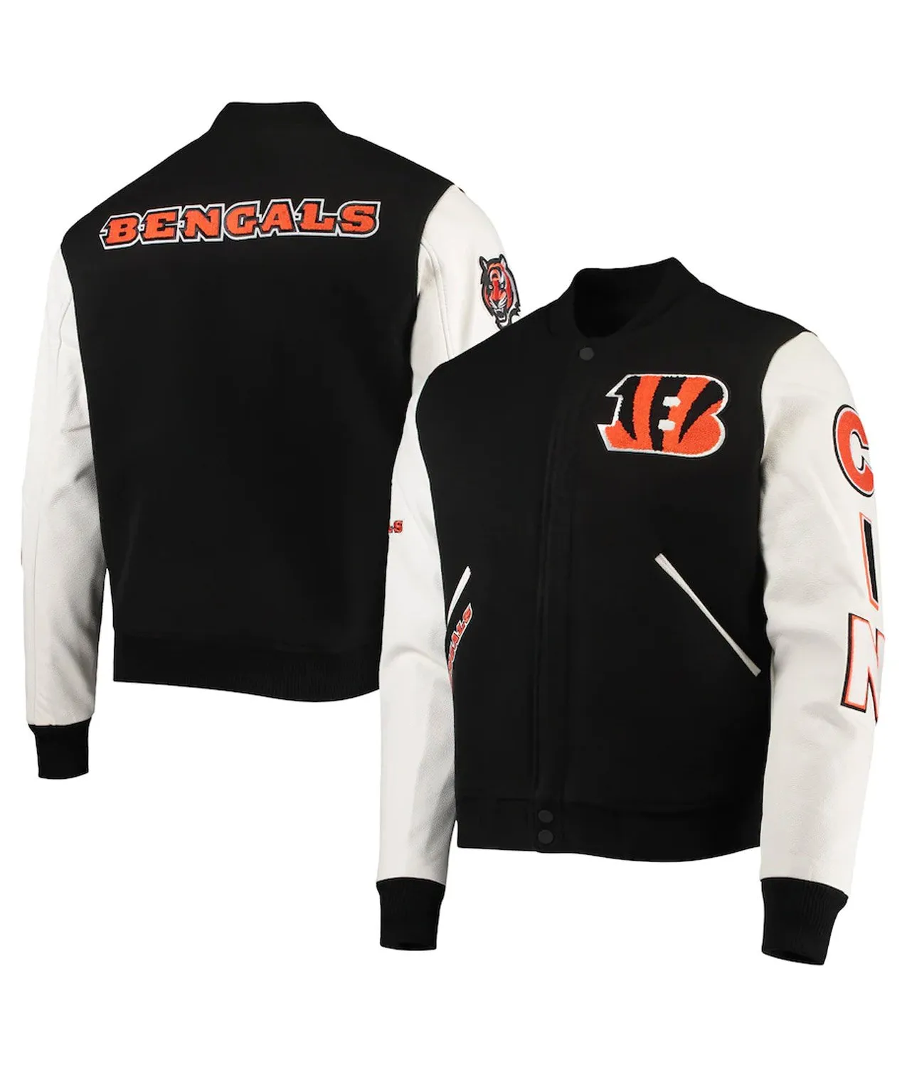 Show your Who Dey pride with a Bengals Varsity Jacket. This black and white tiger stripe jacket is essential NFL game day gear and a classic piece of vintage Bengals style.