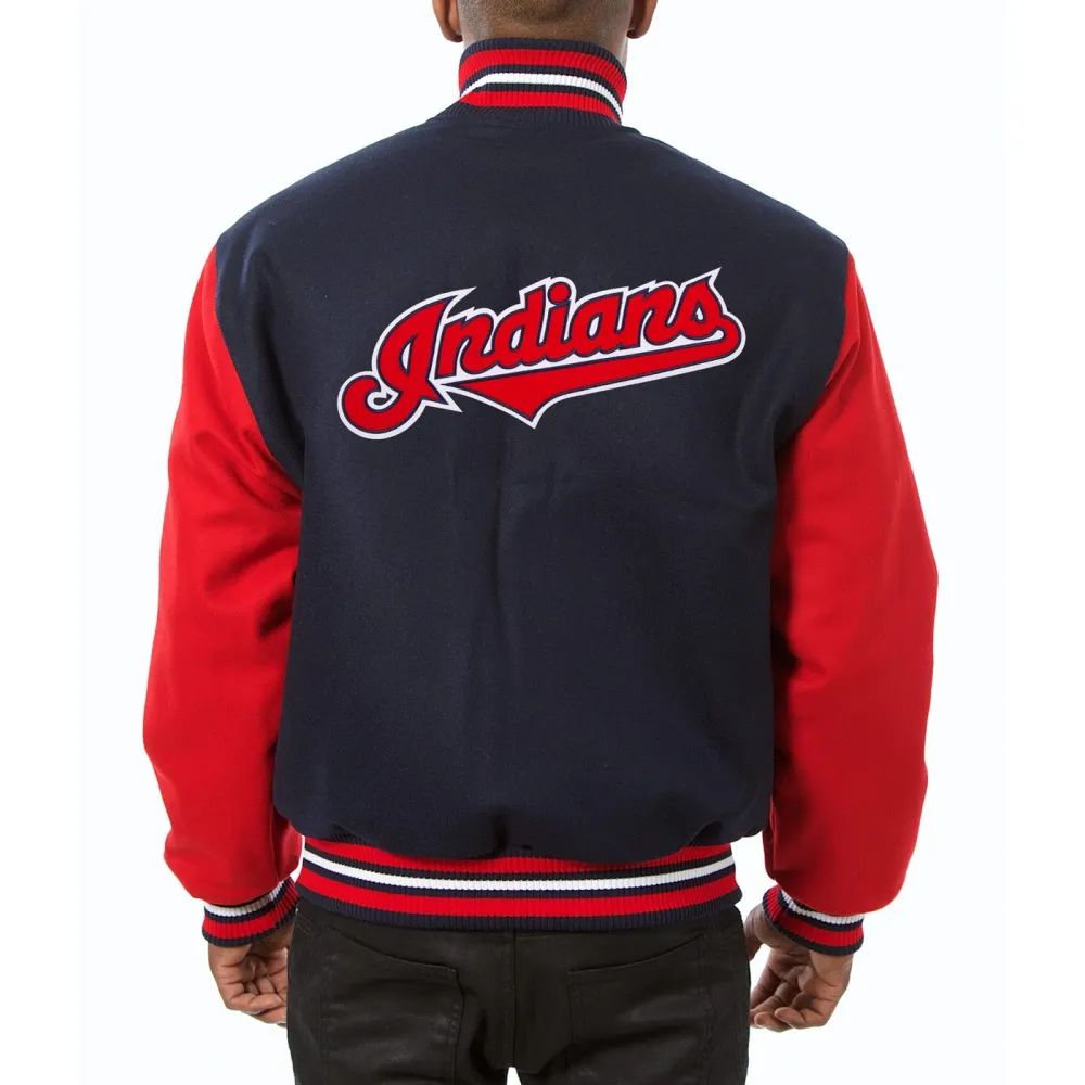 The Cleveland Indians Two Tone Team Players Wool Varsity Jacket Navy & Red is more than just outerwear—it is a symbol of baseball heritage, team loyalty, and classic American style.