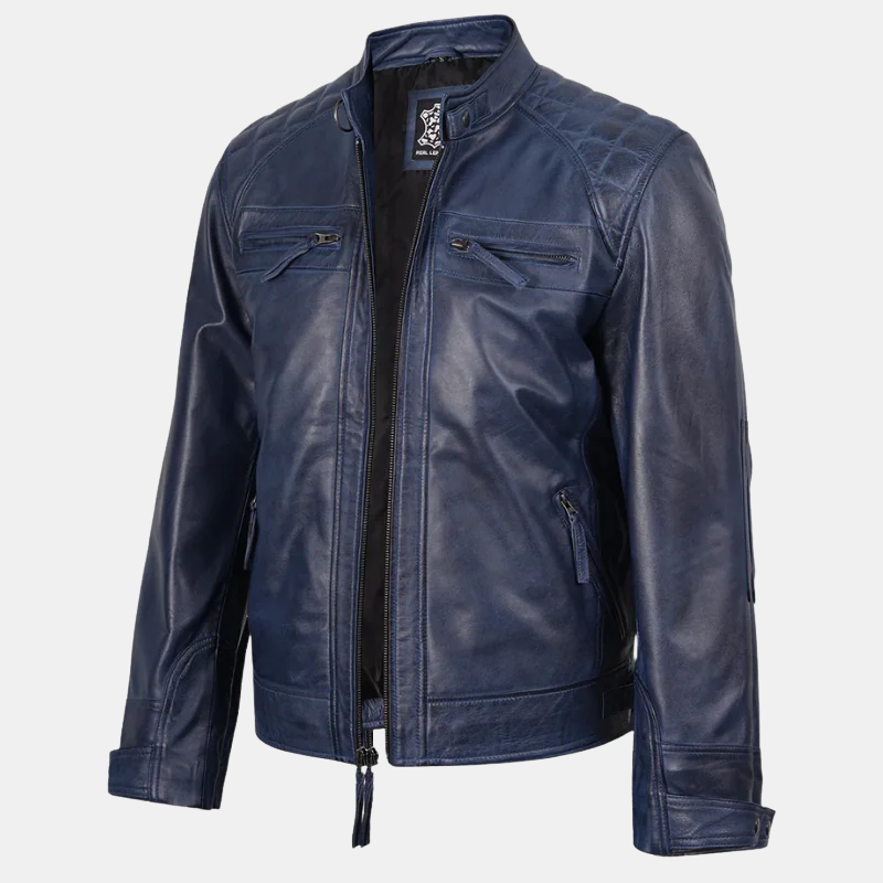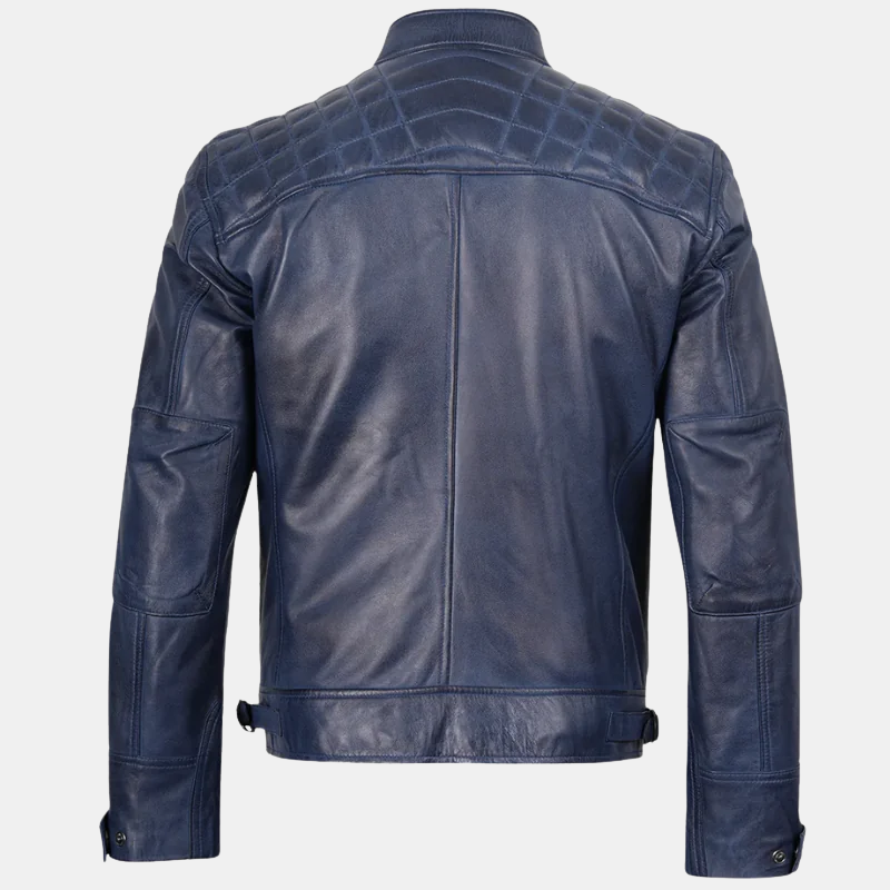 The leather is made from top-quality authentic leather This blue leather motorcycle jacket comes with an aged wax finish that gives a hint of character and depth to its dazzling hue. The slim fit silhouette adds a masculine look to your frame as the quilted shoulders and smooth stitching give the distinct appearance of an blue racer jacket designed for speed and style.