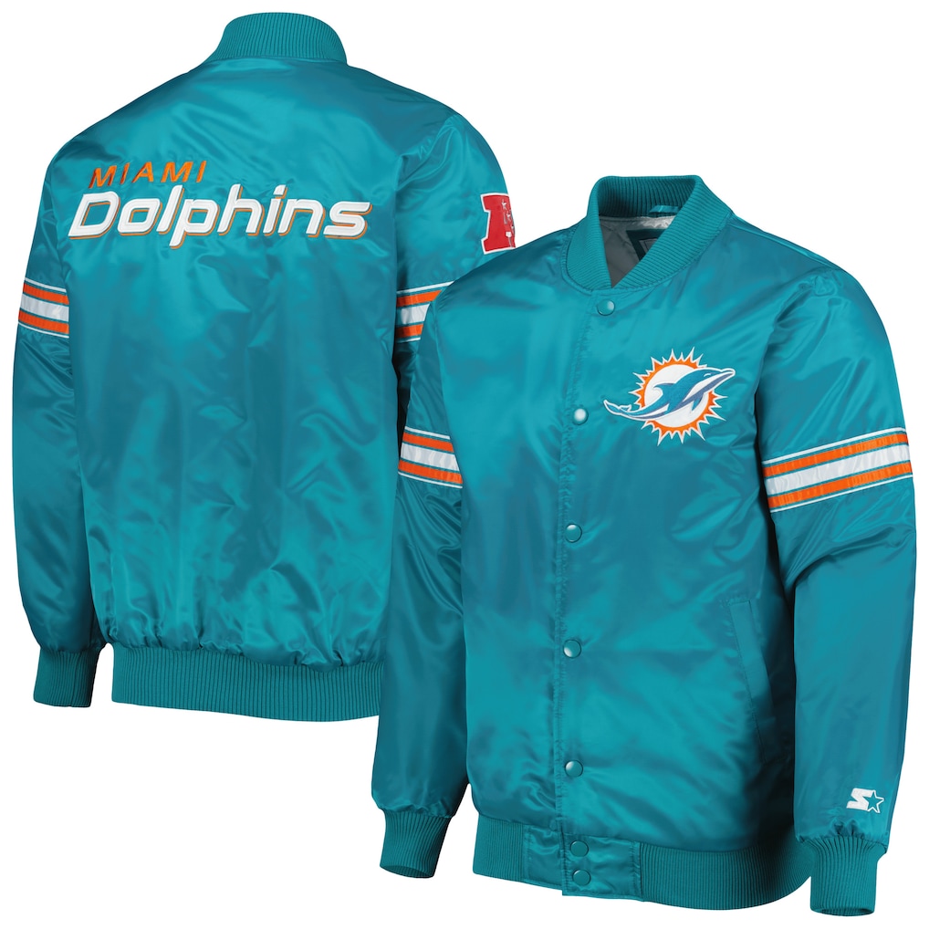 Crafted from high-quality satin polyester, this jacket delivers a sleek, glossy finish that captures the essence of classic Starter designs. The vibrant aqua color reflects the iconic Miami Dolphins team palette, ensuring you stand out whether you’re at the stadium or on the streets. Inside, the soft quilted lining provides warmth and comfort, making it ideal for cooler days and evening outings.