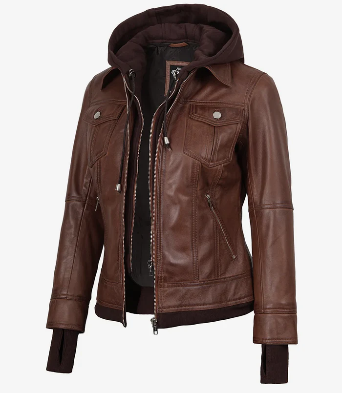 Tralee Women’s Cognac Wax Bomber Leather Jacket With Removable Hood
