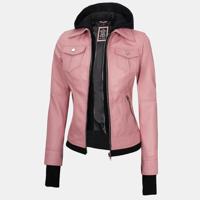 Step into effortless style and comfort with the Tralee Women’s Real Leather Pink Bomber Jacket with Hood. Crafted from premium quality real leather, this jacket is designed to turn heads with its soft blush tone and chic bomber silhouette. The attached hood adds a trendy, laid-back vibe while also offering extra warmth and versatility — perfect for both city strolls and casual hangouts.