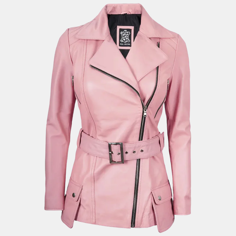 Women’s Pink Asymmetrical Leather Jacket with Stylish Belt Detail
